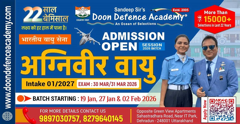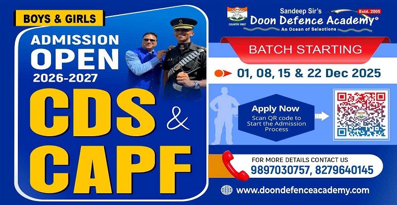 Founded by Mr. Sandeep Gupta, Submariner-Indian Navy (Retd.), the institute focuses on academics, SSB interview preparation, physical training, and character development. Known for high selections in NDA, CDSE, AFCAT, OTA, Indian Airforce, and Navy, Doon Defence Academy remains the best choice for aspiring defence officers.