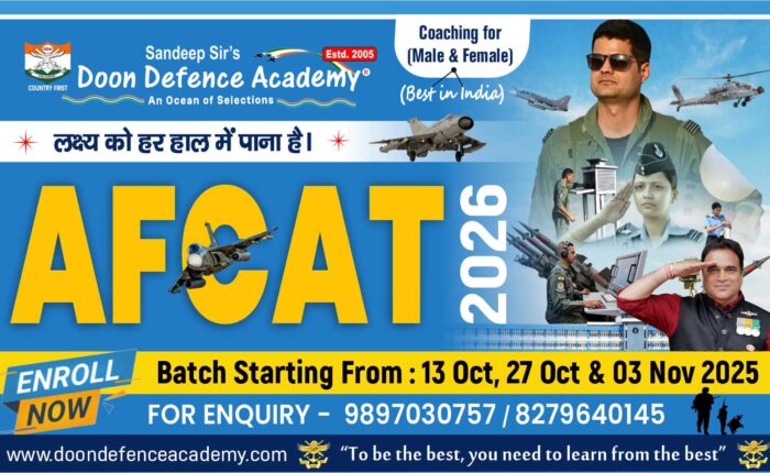 Doon Defence Academy is the No.1 Coaching Institute in India for NDA, SSB-Interview, All recruitment of Indian Army, Indian Navy (AA/SSR), Indian Airforce (Group ‘X’ & ‘Y’), AFCAT, CDSE, INET, MNS, Coast Guard, Merchant Navy written test, Interview of Deck Cadet, Company Sponsorship, Nautical Science, Marine Engineering test, Foundation Course available from Class IX to XIIth and tuitions from Class VIIIth to XIIth (Only CBSE Curriculum) under the DDA Junior Wing etc.