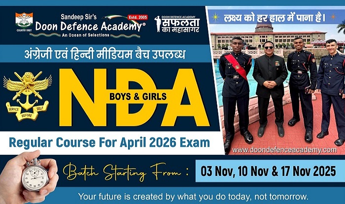 DDA में NDA/CDSE (I) – 2026 जिसकी परीक्षा APRIL 2026 को होनी है, उसके लिए 03 Nov, 10 Nov, 17 Nov & 24 Nov 2025 से DDA में NDA/CDSE Regular Course शुरू हो रहा है। जो बच्चे DDA में NDS / CDSE 01 Year / 06 Months की काॅचिंग करना चाहते है, वह Online Registration करा कर 03 Nov, 10 Nov, 17 Nov & 24 Nov 2025 से NDA/CDSE REGULAR COURSE join कर लें।