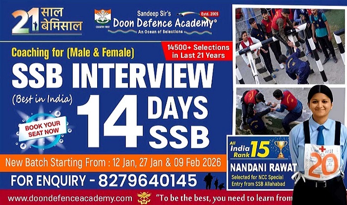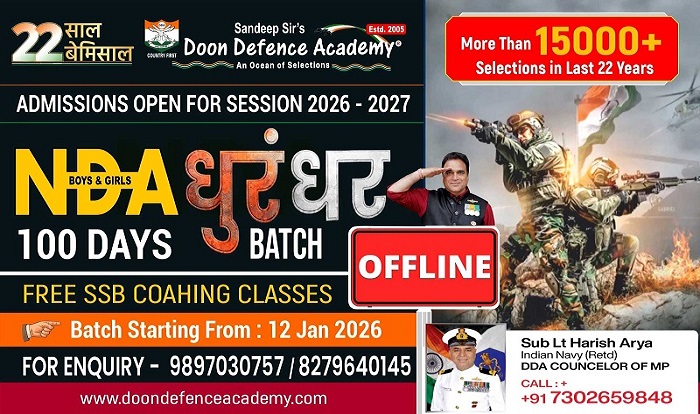 DDA में NDA/CDSE (I) – 2026 जिसकी परीक्षा APRIL 2026 को होनी है, उसके लिए 05 Jan & 12 Jan 2026 से DDA में NDA 100 Days Dhurandhar Batche Regular Course शुरू हो रहा है। जो बच्चे DDA में NDS 100 Days Dhurandhar Batch की काॅचिंग करना चाहते है, वह Online Registration करा कर 05 Jan & 12 Jan 2026 से NDA 100 DAYS DHURANDHAR COURSE join कर लें।