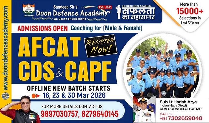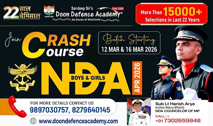 DDA में NDA/CDS (I) – 2026 जिसकी परीक्षा APRIL 2026 को होनी है, उसके लिए 12 Mar & 16 Mar 2026 से DDA में NDA/CDS Crash Course शुरू हो रहा है। जो बच्चे DDA में 01 Month की काॅचिंग करना चाहते है, वह Online Registration करा कर 12 Mar & 16 Mar 2026 से NDA/CDS CRASH COURSE join कर लें।