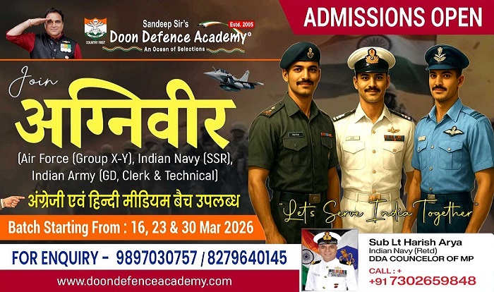 DDA में AGNIVEERS (Army, Navy, Airforce) जिसकी परीक्षा 2026 को होनी है, उसके लिए 16 Mar, 23 Mar, & 30 Mar 2026 से DDA में Agniveers Regular Course शुरू हो रहा है। जो बच्चे DDA में 01 year / 06 months / 04 months की काॅचिंग करना चाहते है, वह Online Registration करा कर 16 Mar, 23 Mar, & 30 Mar 2026 से AGNIVEERS REGULAR COURSE join कर लें।