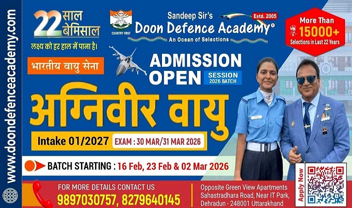 DDA में Agniveervayu (Intake 01/2027) जिसकी परीक्षा 30 Mar/ 31 Mar 2026 को होनी है, उसके लिए 16 Feb, 23 Feb & 02 Mar 2026 से DDA में Agniveervayu (Intake 01/2027) Regular Course शुरू हो रहा है। जो बच्चे DDA में Agniveervayu Batch की काॅचिंग करना चाहते है, वह Online Registration करा कर 16 Feb, 23 Feb & 02 Mar 2026 से Agniveervayu (Intake 01/2027) join कर लें।